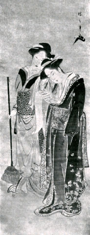 A Travesty on Han-Shan (Kanzan) and Shih-Te (Jittoku) By Katsukawa Shunsho (1726-92) Japanese, Ukiyo-I: School In the Museum of Fine Arts Boston The two poet-hermits are here represented as women: one reading a love-letter instead of the blank scroll peculiar to Han-Shan; the other holding an ordinary indoor broom instead of the besom carried by Shih-Te. Painted in colors on silk and mounted as a kakemono.