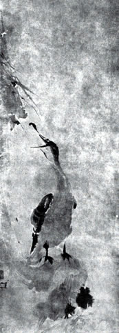 These are cases in which secularization of Buddhist art is indeed apparent; but the process was, carried so far by the later genre painters that Fugen came to be represented as a courtesan reading a love-letter and Kwannon as a maid coming from the market with her basket of fish. Such pictures are manifest instances of sacrilege against the Zen ideal (A Travesty on Han-Shan (Kanzan) and Shih-Te (Jittoku) By Katsukawa Shunsho (1726-92) ; but on the other hand there was a more serious secularization which, though worldly in content, nevertheless retained, in composition and brush strokes, the "wind-frame" of Zen painting. In Japan this is first noticeable among works by Kano Masanobu (died 1490) and his son Motonobu (1475-1559), and has been perpetuated by their descendants of the Kano Academy , an idealistic school with strong romantic tendencies.