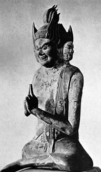 Dai-Itoku-myowo, the Great Majestic Power Japanese, Tenth Century In the Museum of Fine ArU, Boston Although his typical figure has six faces which exhibit the six miraculous powers, and six arms which purify the six resorts of transmigration, he is shown in this wood sculpture of the Fujiwara period with but three faces and two arms, the latter joined in the mystic form of the one-pointed vajra.