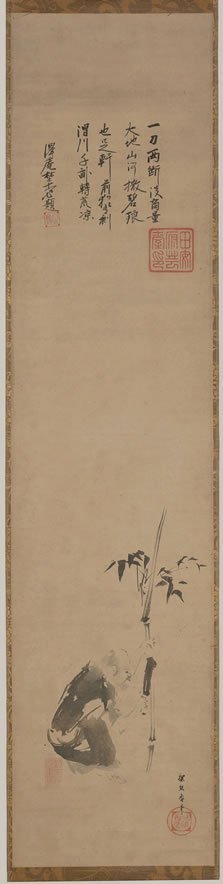 Ink on paper The painting was executed by Kano Tan'yu, the shogun's official painter, and was inscribed by Takuan Soho (1573–1645), one of the most prominent Zen monks in Japan's history. Copying a world-renowned early thirteenth-century painting by Southern Song Chinese master Liang Kai (Tokyo National Museum), Tan'yu described the historic moment in Zen legend when the sixth patriarch, Huineng (638–713), suddenly achieved enlightenment while performing the mundane task of splitting a bamboo branch for firewood. Datable to 1635–45 both from the artist's signature and because Takuan died in 1645, the painting vividly demonstrates the young Tan'yu's skill. With just a few animated brushstrokes in light ink, he captured the spirit of the Zen parable, his manipulation of the broad ink wash leaving much to the viewer's imagination.