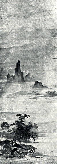 The grandeur or tranquility of nature seen through the spiritual eyes of one purified by long training in Zen; the changes of life and season absorbed into the calm depth of contemplation; — such impressions the painter strove to catch with simple, bold strokes of his brush and with little color. Distant hills like shadows; water marked out by a few ripples; sails and boats just dotted in; rocks and trees drawn with a few touches; these make up a landscape. Human figures are often added to the scene, and appear to be gazing beyond the expanse of water, or loitering in the moonlight, or looking up at the cliffs and waterfalls. They are meant to be Taoists or Zenists whose presence in the picture shows that they are seeing the view as reflected in their purified minds.